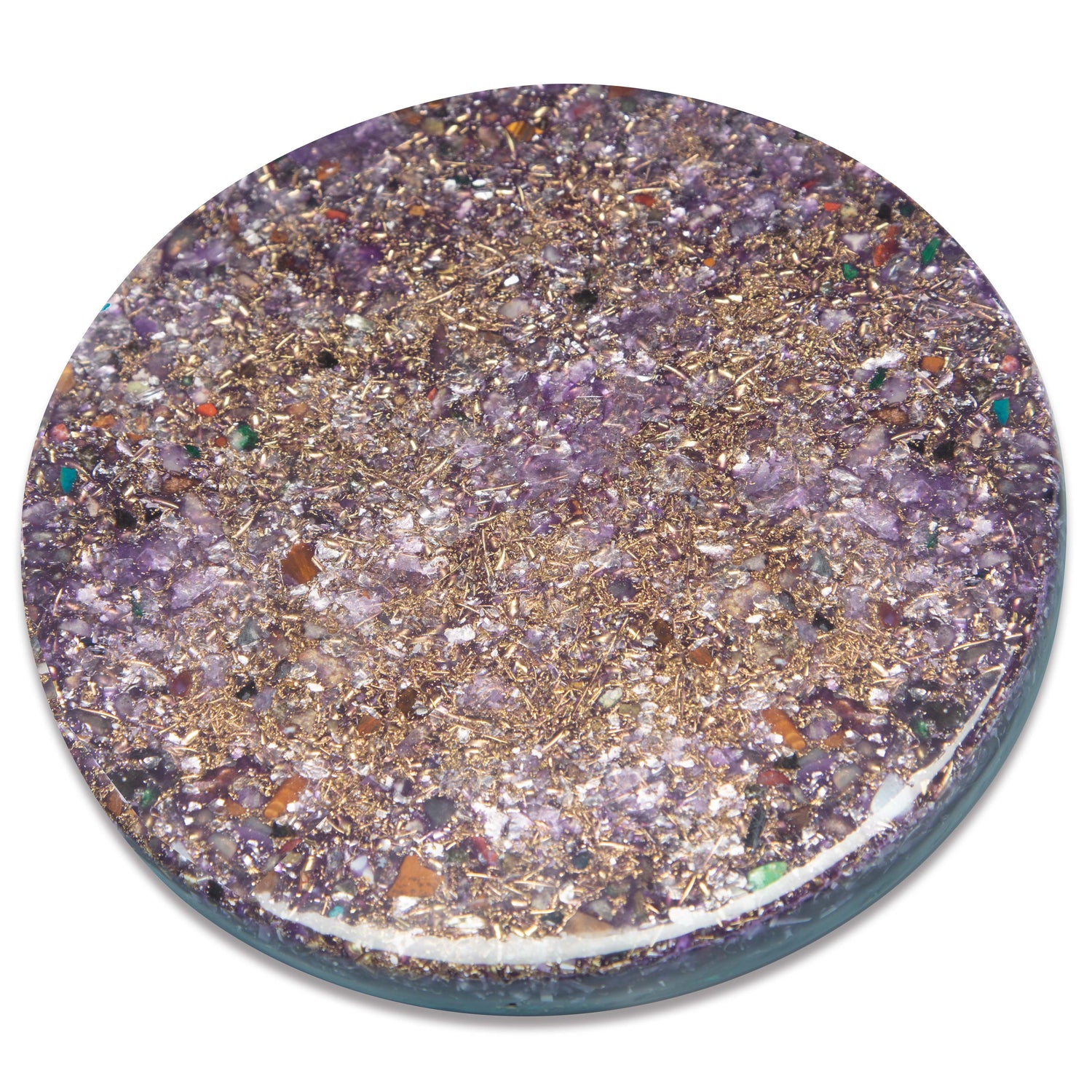 The metal in the Orgonite Matrix is partly brass which gives the plate an extra smooth and warm healing energy.